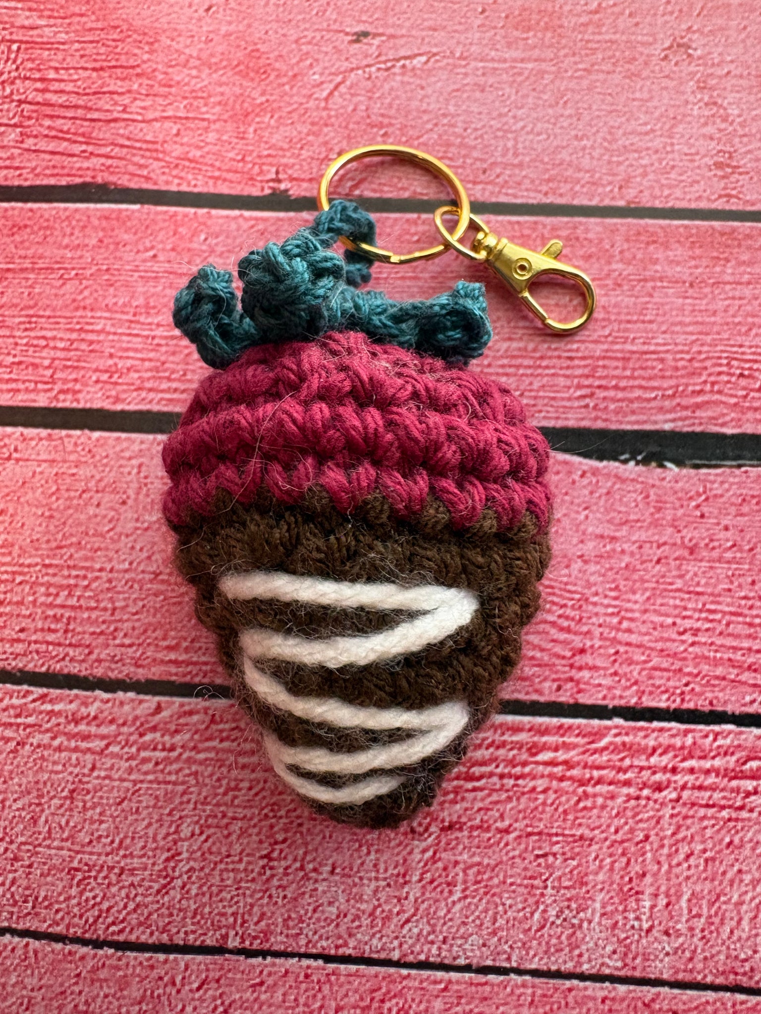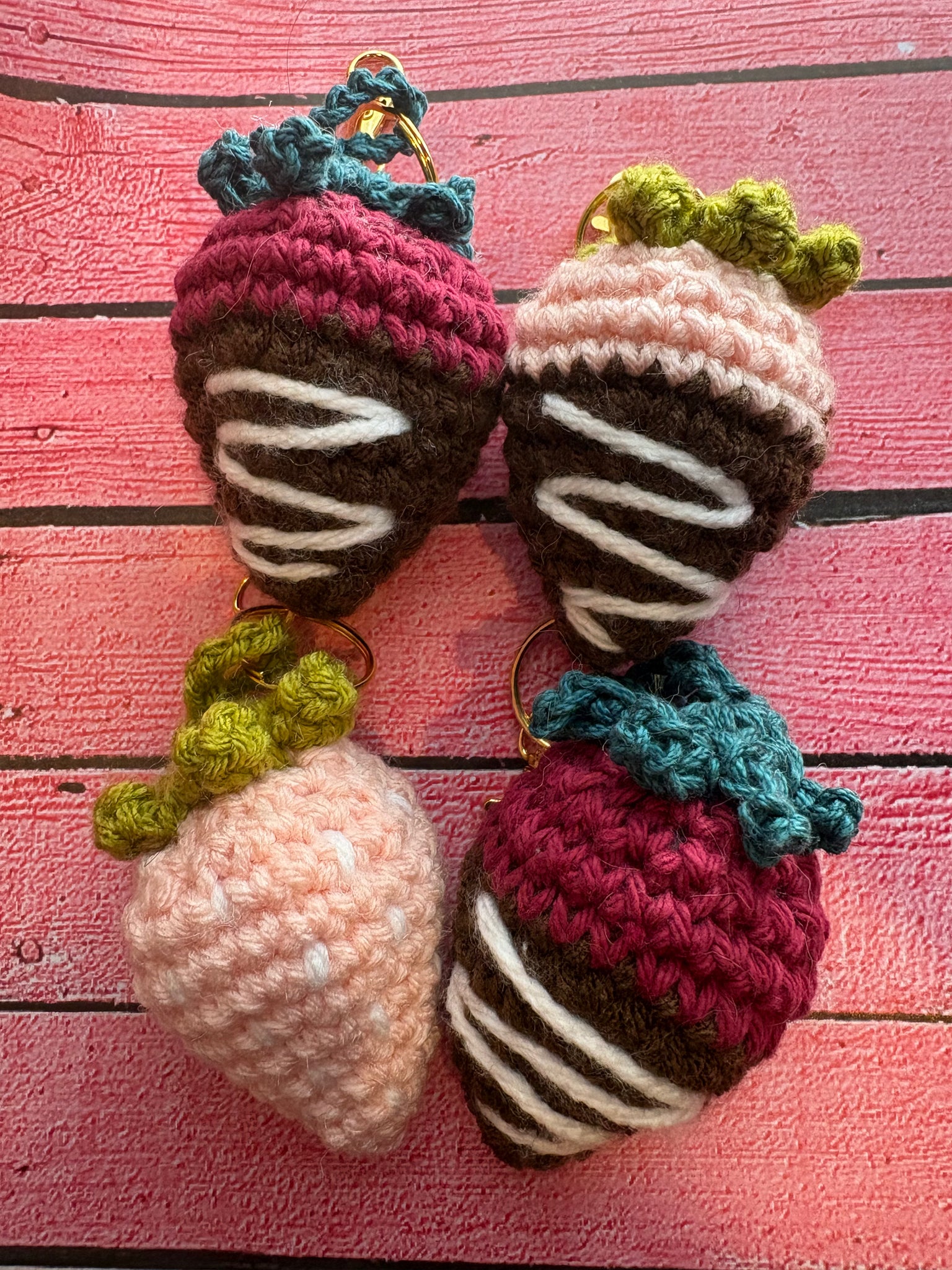 These handmade strawberries measure to be approximately 3 inches and come with a gold keychain.